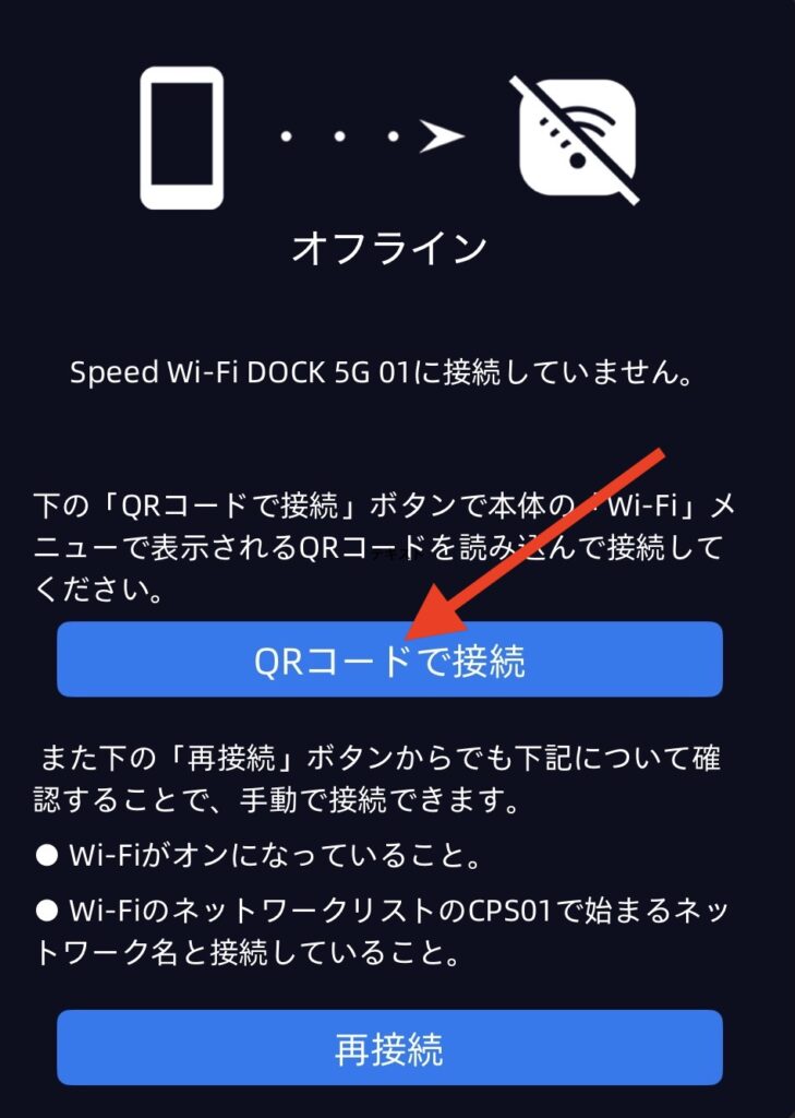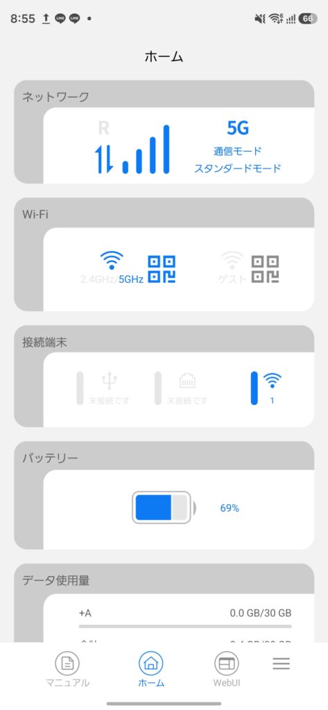 Androidの場合は「QRコードで接続」という項目がないですが、同じように端末に表示されたQRコードをスマートフォンで読み取り、Wi-Fiと接続し、再度「Speed Wi-Fi DOCK 5G Tool」のアプリを開いてください。以下のような設定画面が表示されればOKです。