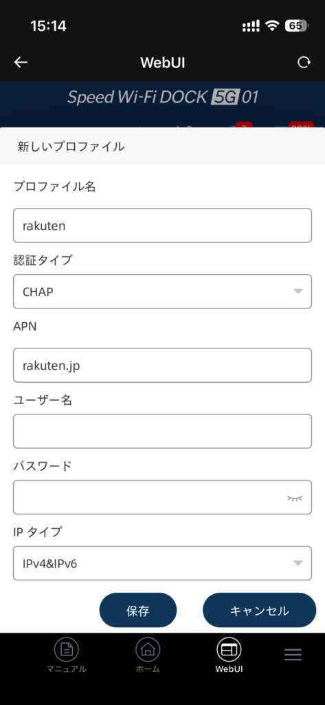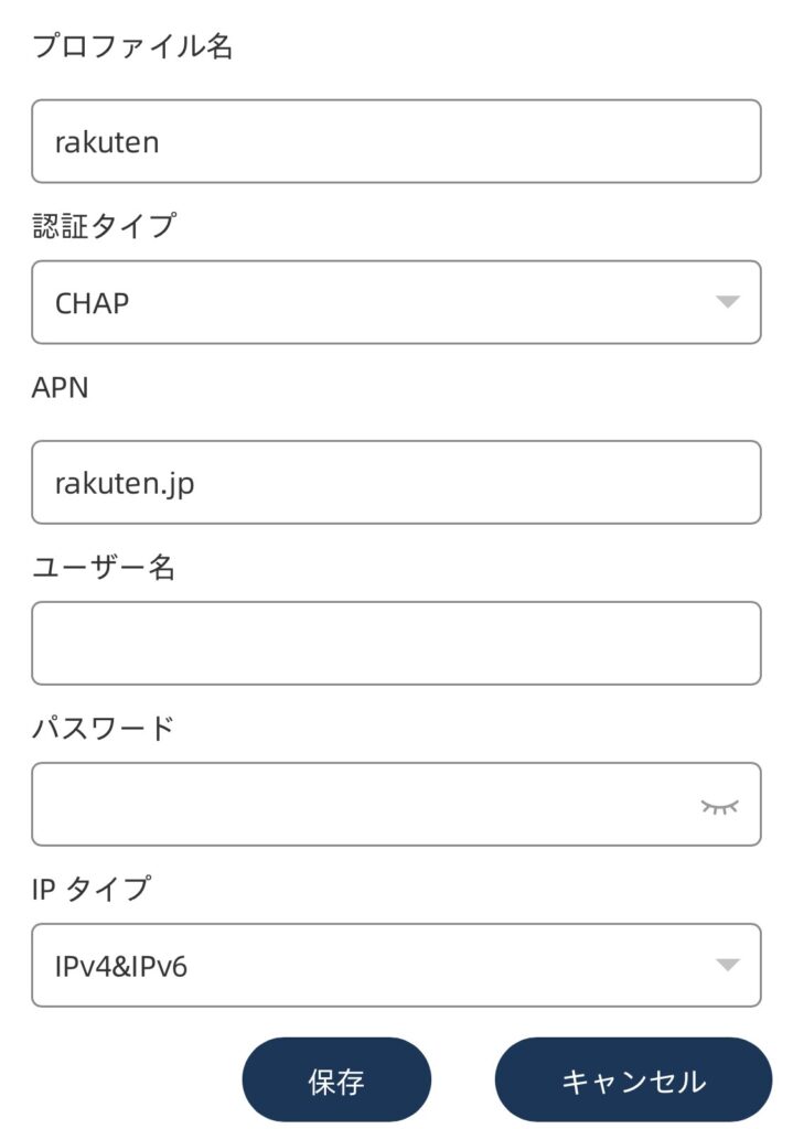 すると新しく設定するプロファイル画面へと切り替わりますので、楽天モバイルのプロファイル情報を入力します。以下のまま入力すればOKです。