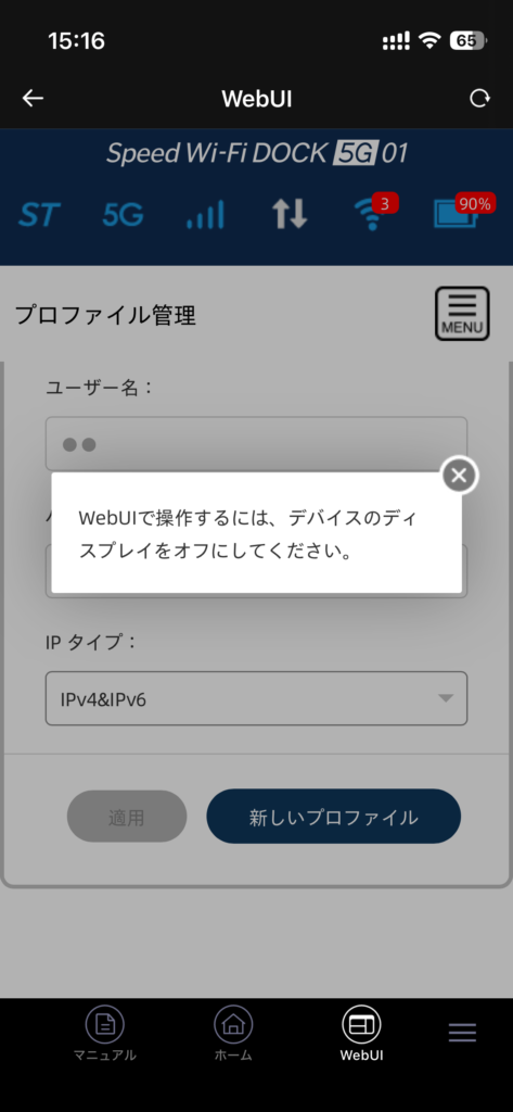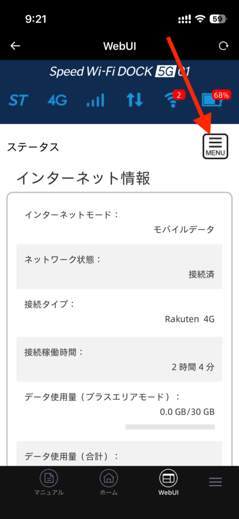 もしくは、Speed Wi-Fi DOCK 5G 01の本体メニュー画面から