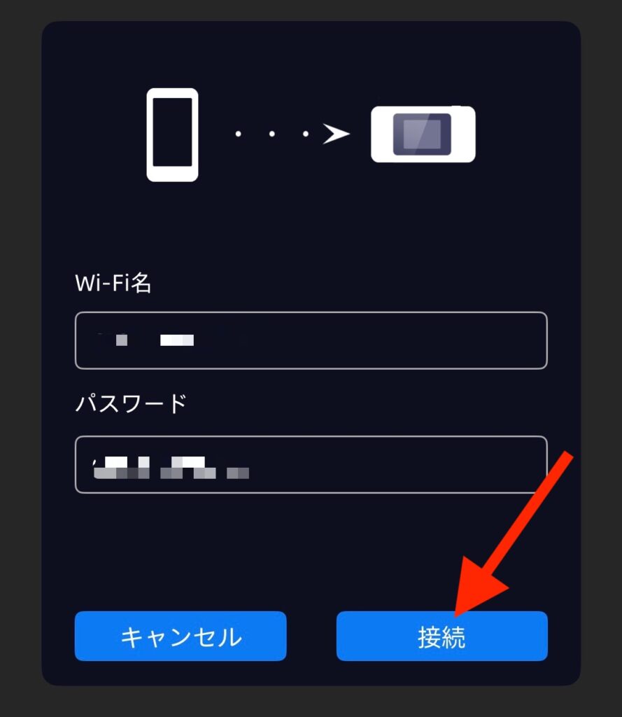 Wi-Fi名とパスワードが表示されますので、「接続」をタップするとWi-Fiとの接続は完了です。