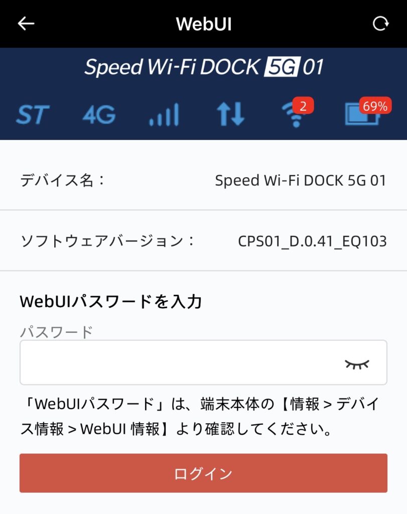 「情報」→「デバイス情報」→画面下へとスクロール→「WebUI情報」の順にタップ