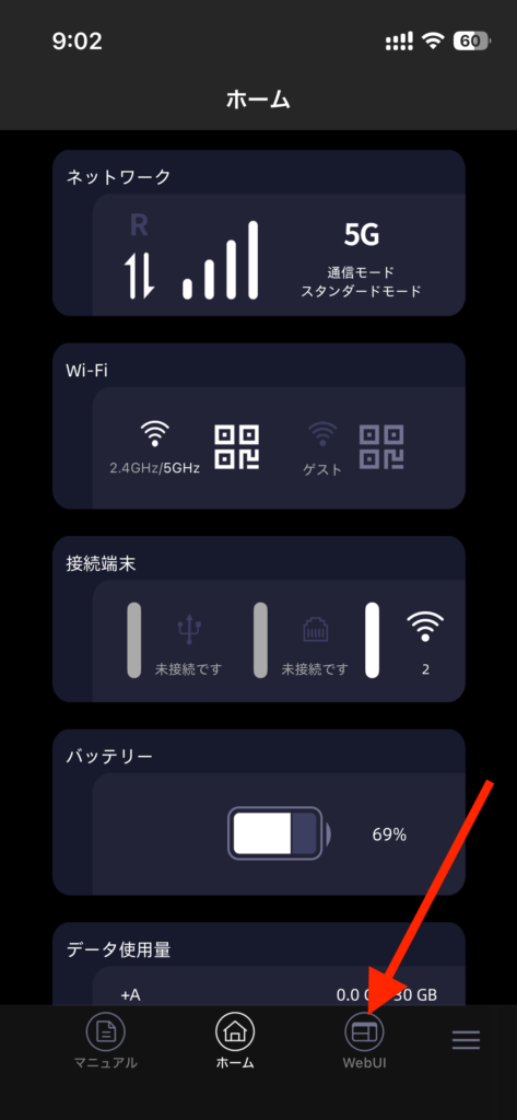 アプリのホーム画面の一番下にある「WebUI」をタップします。